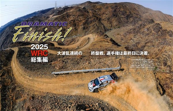 2024年まで最終戦だったラリージャパンのあとに、2025年に初開催となるサウジアラビアで王者が決定することに。トヨタドライバーによる最後まで分からないチャンピオン争いは、中東の難しいステージに翻弄されながらも、パートタイム参戦のセバスチャン・オジエが獲得。さらにオィット・タナックのフルタイム参戦終了など、シーズン終了間際まで様々な話題満載だったシーズンを、各ドライバーのインタビューとともに一気に振り返ります。また、ランチアのWRC復帰や全日本ラリー選手権のシリーズ詳細、チャンピオンとなり日本を離れるヘイキ・コバライネンのインタビューも掲載。そして恒例の別冊付録である2026 World Rally Calendarもついてきます!