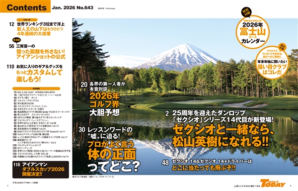 お待たせしました! 特別付録は毎年ご好評をいただいております、「富士山 が映える」コースカレンダー。ニッポンのお正月だからこそ見たくなる日本一の山、富士山。人気コースに悠然と写り、四季折々の表情を見せる富士山をじっくりと眺めて堪能してください! ちなみに2026年は2月号にも「富士山カレンダー」の付録が付きます。