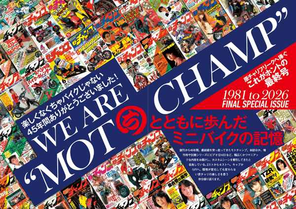 モトチャンプは1981年の創刊以来、ミニバイクを核に数々のカスタム&チューニング文化を創出してきました。約45年という長い間、月刊誌として走り続けることができたのは、ともに楽しんでくれた皆様のおかげです。ありがとうございました。そんなモトチャンプの最終号では、「モトチャンプとともに歩んだミニバイクの記憶」を巻頭特集に、「まるちステッカー」と「128ページ小冊子・モトチャンプ傑作集」をダブル付録でお届けします。「楽しくなくちゃバイクじゃない」をスローガンに突っ走ってきたモトチャンプ最後の一冊。ぜひ最後までお付き合いください!