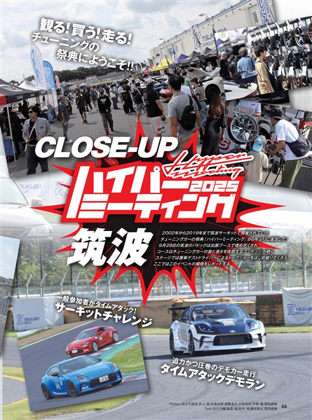 巻頭特集は『土屋圭市ドライビングバイブル 最新版』です。レース&ドリフトのレジェンドとして、これまで語ってきたドライビングテクニックと、現在の若手トップドライバーから吸収した「いまどきのクルマ&タイヤの走らせ方」を18ページに集約。ドリキンが伝えたい『攻めの走り』の本質がわかります。車種別特集は『GRヤリス/GRカローラ/GR86/BRZ』です。ベース車自体が年々進化を遂げていますが、アフターパーツメーカー、プロショップもそれに追従。最新型用だけでなく、初期型用も含めて、魅力的なパーツやメニューを紹介します。先代ZN6 86/ZC6 BRZの新たな可能性にも言及。そのほか、『ブレーキチューニング最前線』『ハイパーミーティング2025筑波エキサイティングレポート』を特集。