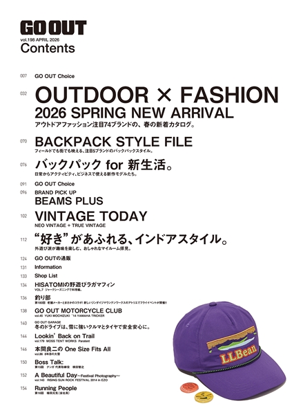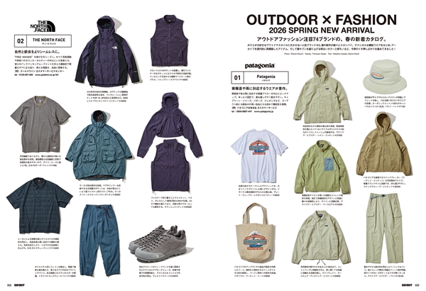 GO OUT vol.198 4月号『OUTDOOR × FASHION 2026 SPRING NEW ARRIVAL』では、ボクたちの大好きなアウトドアファッションで注目すべき全74ブランドの、春の新着アイテムを一挙ご紹介します!