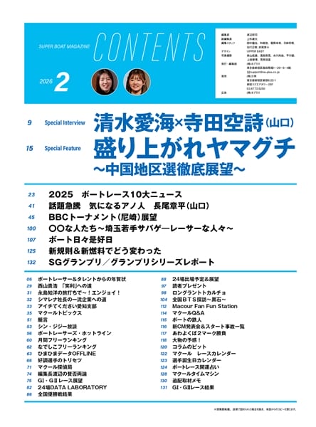 山口支部選手応援企画「ぶちかませヤマグチ!」から1年、新人選手も増えて75人が所属している山口支部。25年の支部の動向をまとめ、26年、もしくはさらにその先で活躍しそうな選手を見つけだそう。また後半パートでは1月29日から下関で開催されるGⅠ中国地区選手権の大展望をお届け。地区選の舟券に大いに役立てていただきたい。