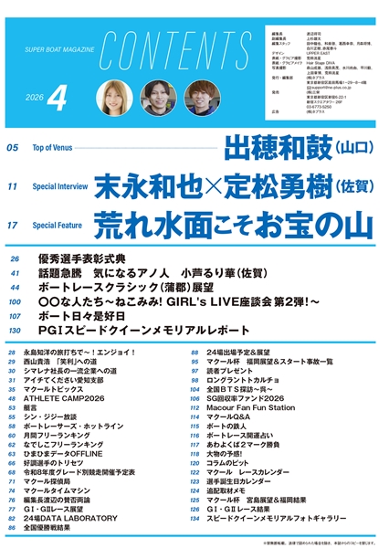 表紙&グラビアには、現在18歳の出穂和鼓が登場。下関フレッシュルーキーに選出された期待のルーキー。ニックネームは白井英治に命名された「デホちゃん」と元々呼ばれている「わこ」。今、注目の若手のプライベートショットを見逃すな!