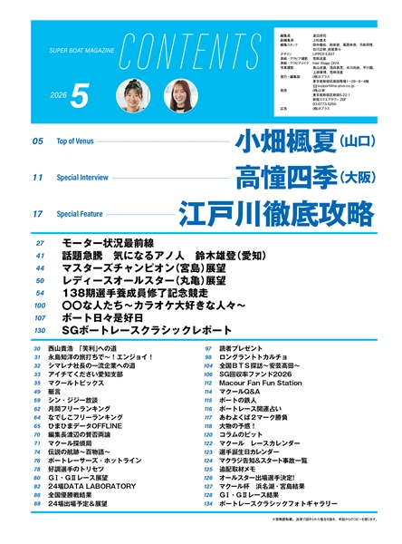 表紙&グラビアには、小畑楓夏が登場。「乗れる時間があったら、いくらでも乗っていたい」ほどボートが好きだという小畑。目標は27歳までのヤングダービー出場。憧れは清水愛海、井上遥妃が「かわいくて推し」だという彼女のプライベートショット。新コーナーの「小畑楓夏とは…」もお楽しみに!