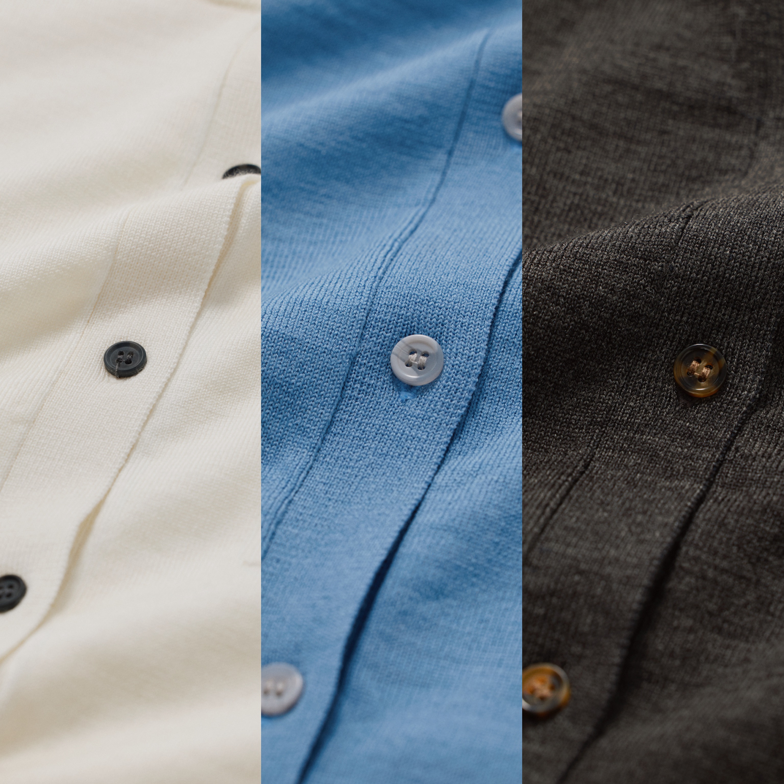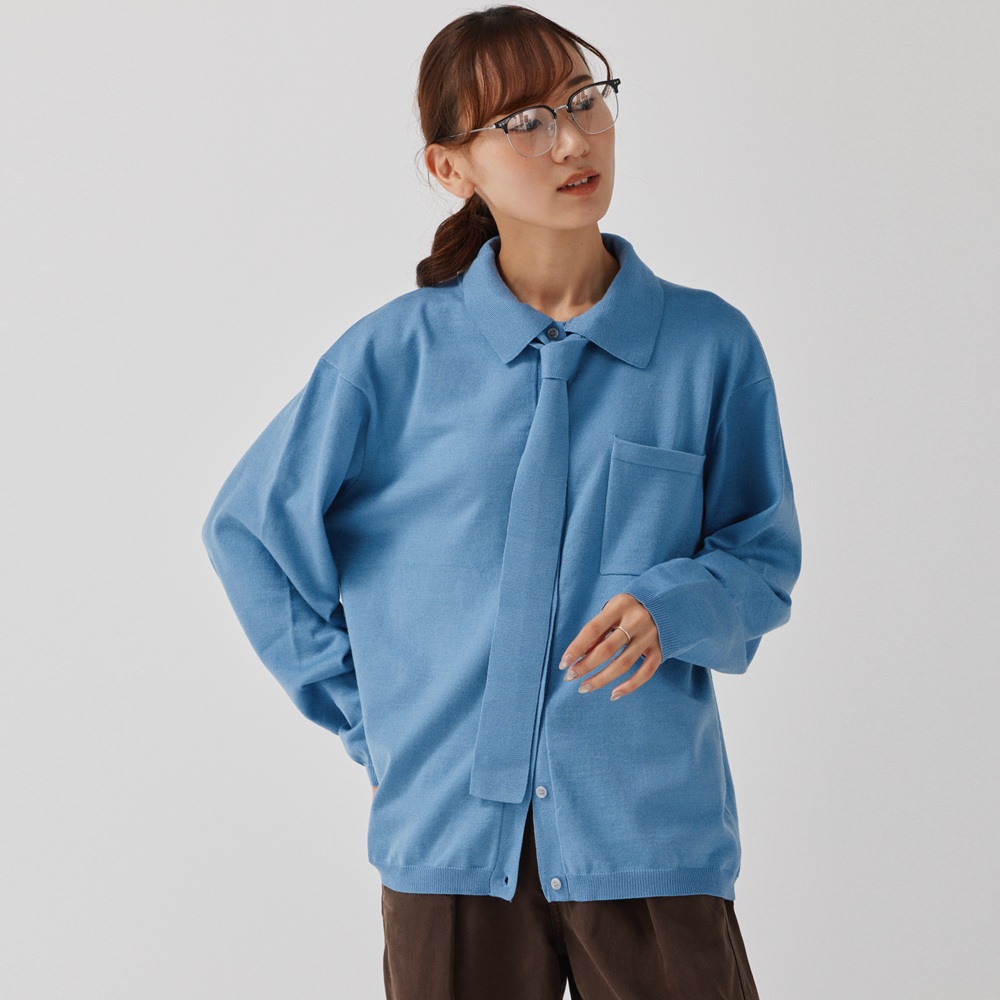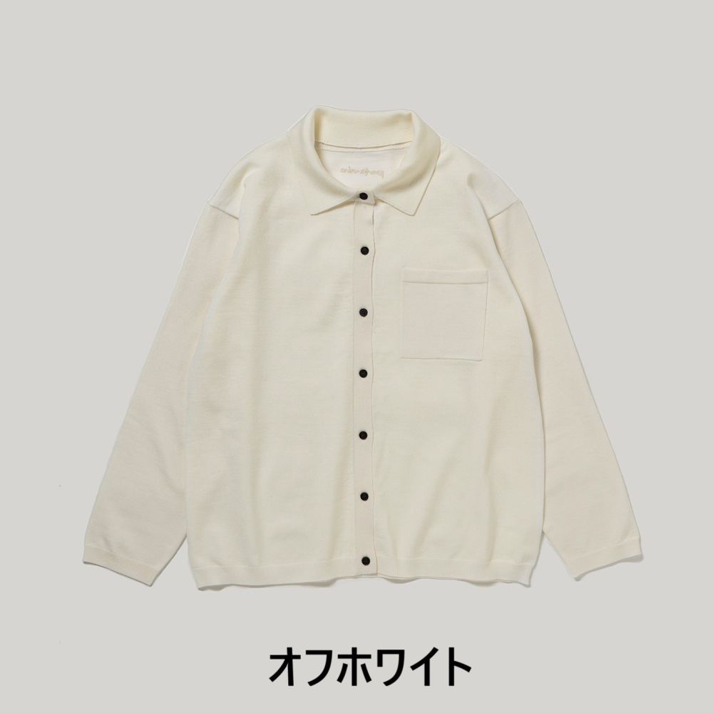 ●カラーリングはオフホワイトの他、サックスブルーとミックスチャコールの全3色展開。共地のタイが付属します。M・Lの2サイズを用意。