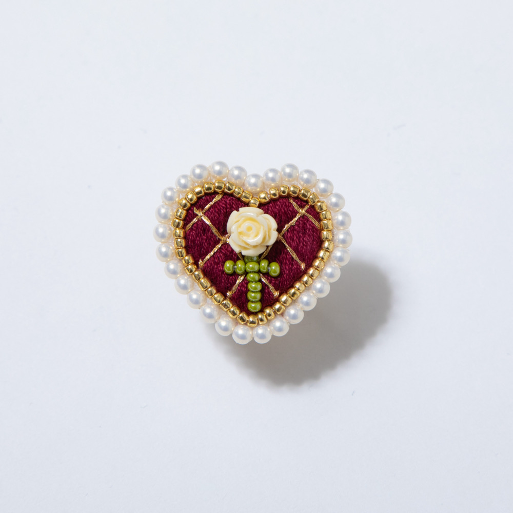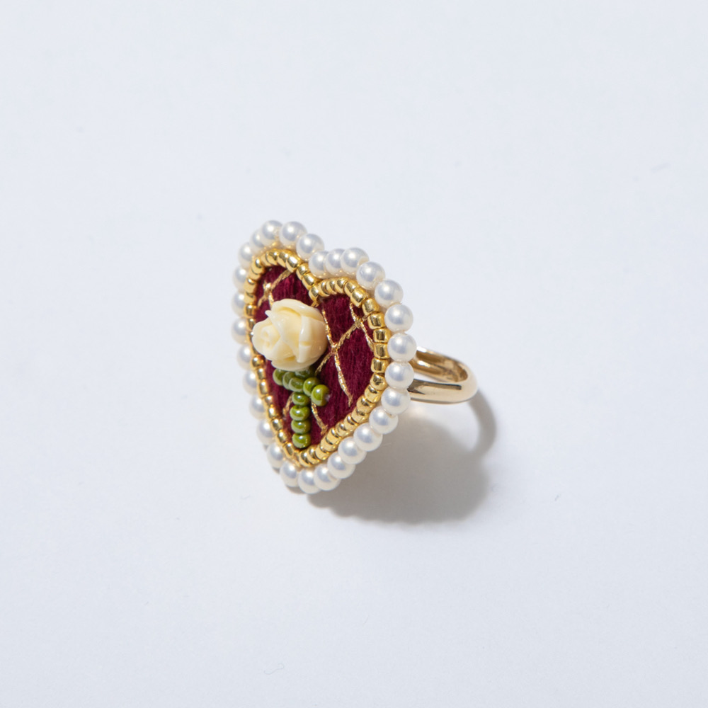 - 特別な日をテーマに真っ赤なハートと薔薇の花を合わせた華やかなデザインに仕上げました。白い薔薇の花は珊瑚で作られており、それぞれ少しずつ表情が違う一点物です。
