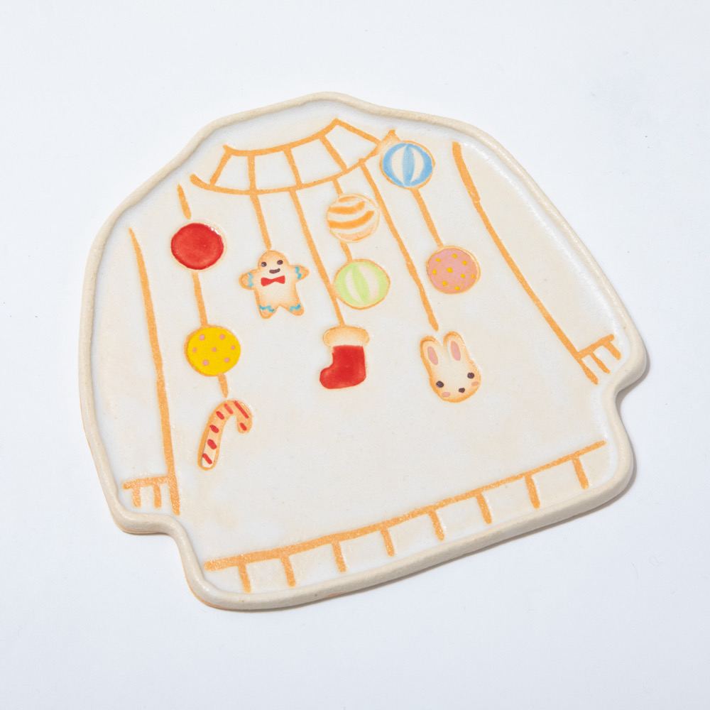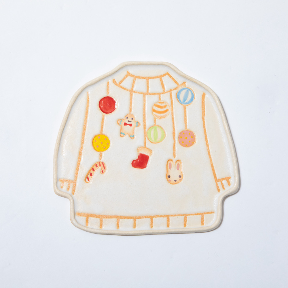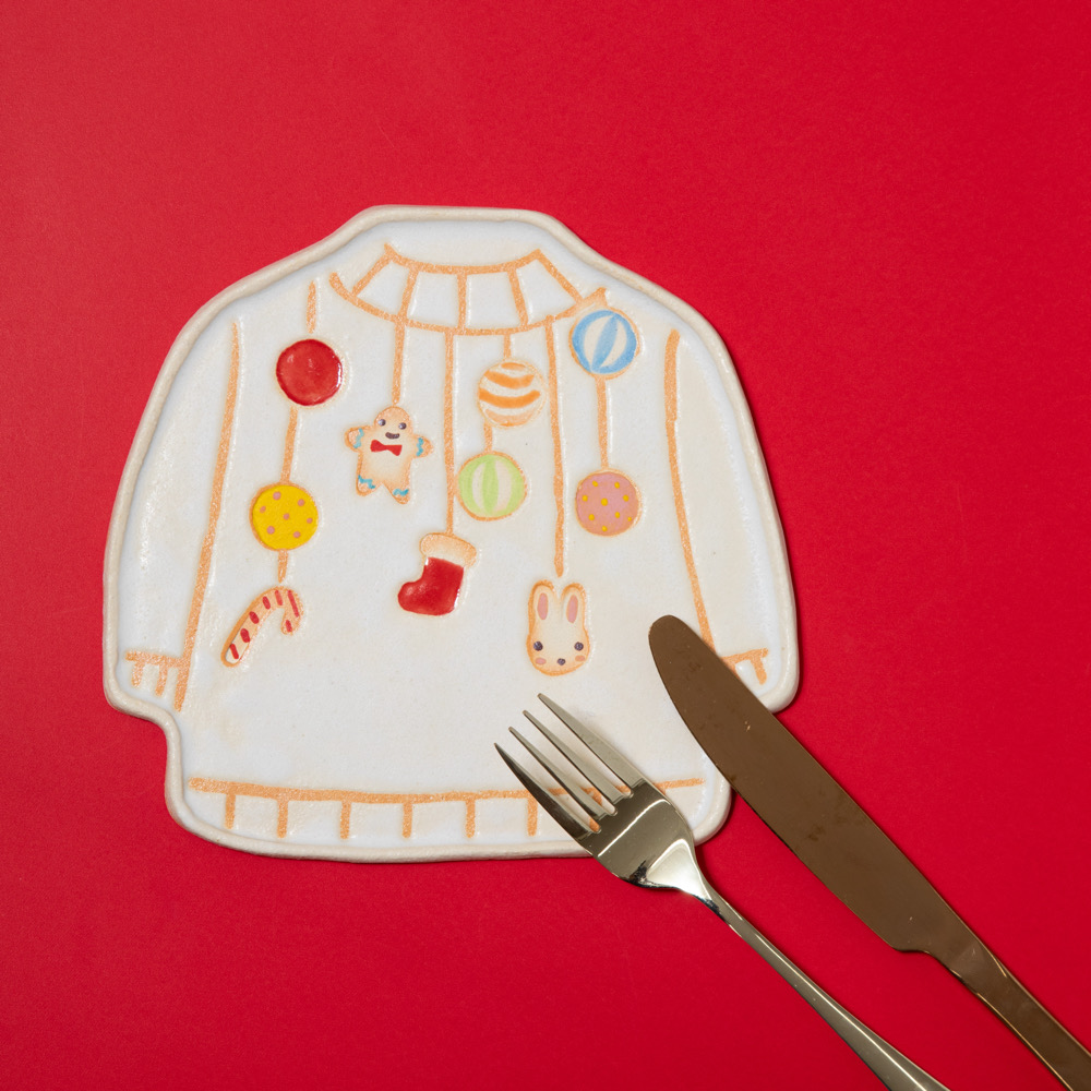 食卓が楽しくなる洋服の形をした可愛くてユニークな洋服のプレートを作成する人気陶芸家の『木村涼子(キムラリョウコ)』。人気のセーターのシリーズにクリスマスオーナメントを施したクリスマスバージョンのお皿が届きました。