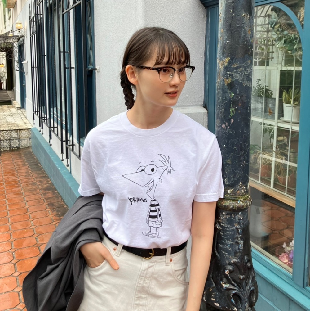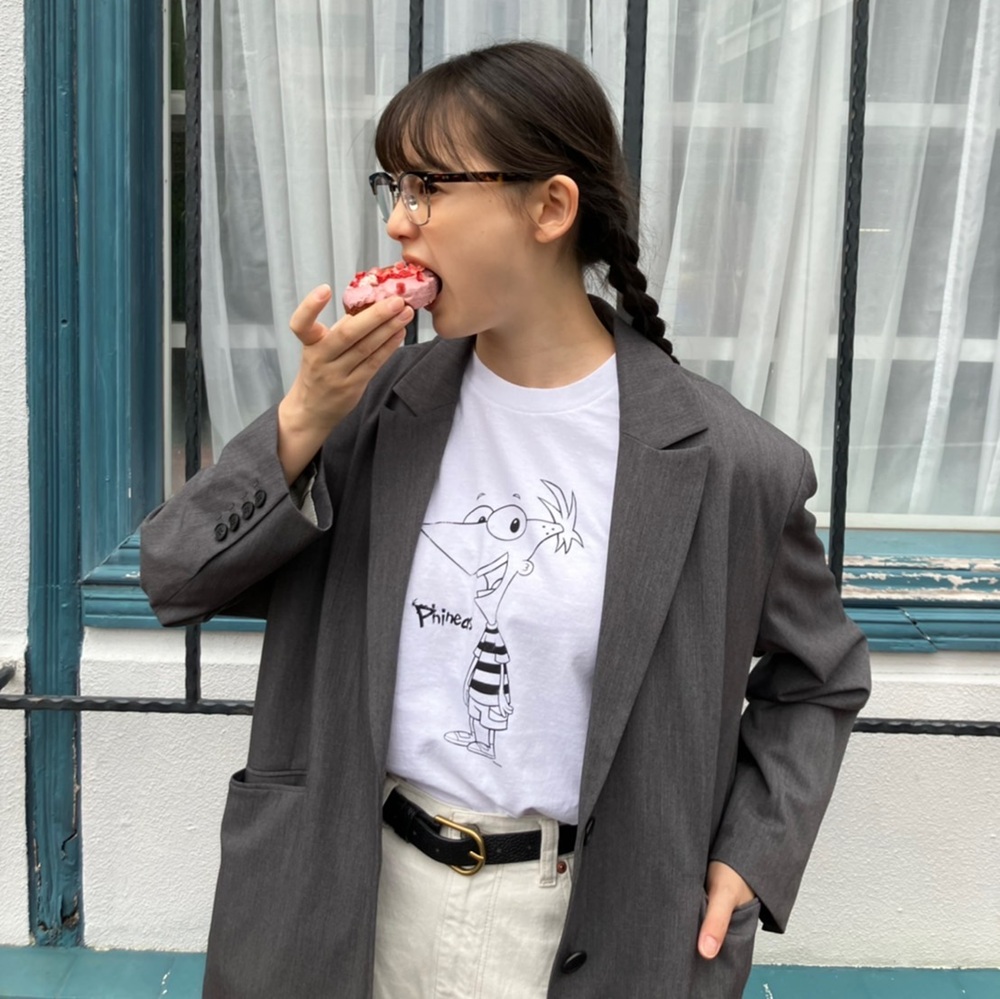 毎日ワクワクするアイデアを思いつく天才、フィニアスの姿をフロントにオン。明るく前向きな性格を彷彿とさせる、ニコニコ笑顔が愛らしい。紺ブレにスウェットパンツ、ベースボールキャップのアイビーテイストなスタイリングには、オーバーサイズのXLがベストマッチ。裾はパンツインとブラウジングで、抜け感を添えて。