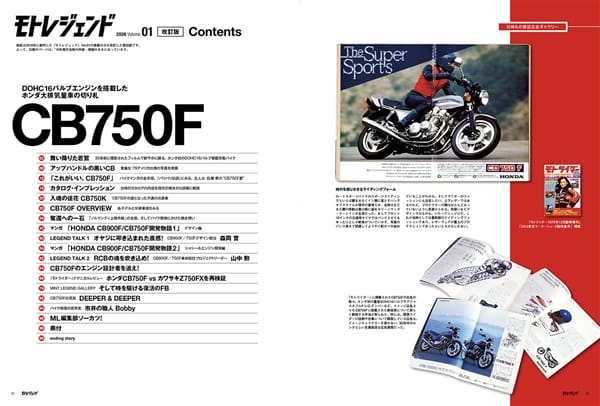 「開発ストーリーから読み解くバイクと人」を副題(=テーマ)にした『モトレジェンド』の創刊は2016年。シリーズ全号絶版となっていましたが、このたびCB750Fを特集した創刊号(Vol.01)を再販します。理由は市場からのご要望と“CB”の名を受け継いだCB1000Fがホンダから発売されたから。ホンダ二輪車の「雄」であるCBの深淵に触れられるよう、オールカラーの100ページ立てとなっています。