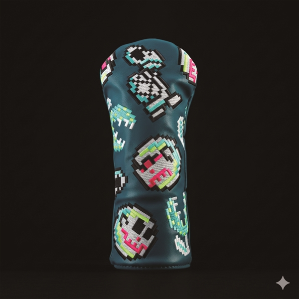 ドクロ、火の玉、溶岩などのゲームに登場しそうな8ビットのキャラクターが描かれたヘッドカバー。ゲームマニアを自称する方に。